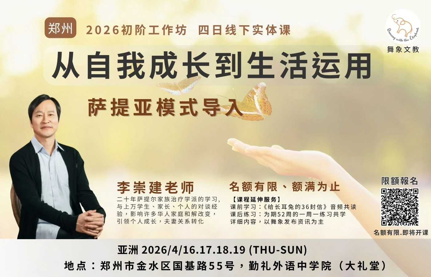 2026《李崇建 – 郑州 初阶工作坊》,以四天扎实深入的萨提亚初阶训练,带你走进一段真正属于「自己」的旅程。李崇建老师以多年教学与疗愈经验,陪伴你一点一点梳理生命的纠结,让心重新松动、呼吸、再度有力量。